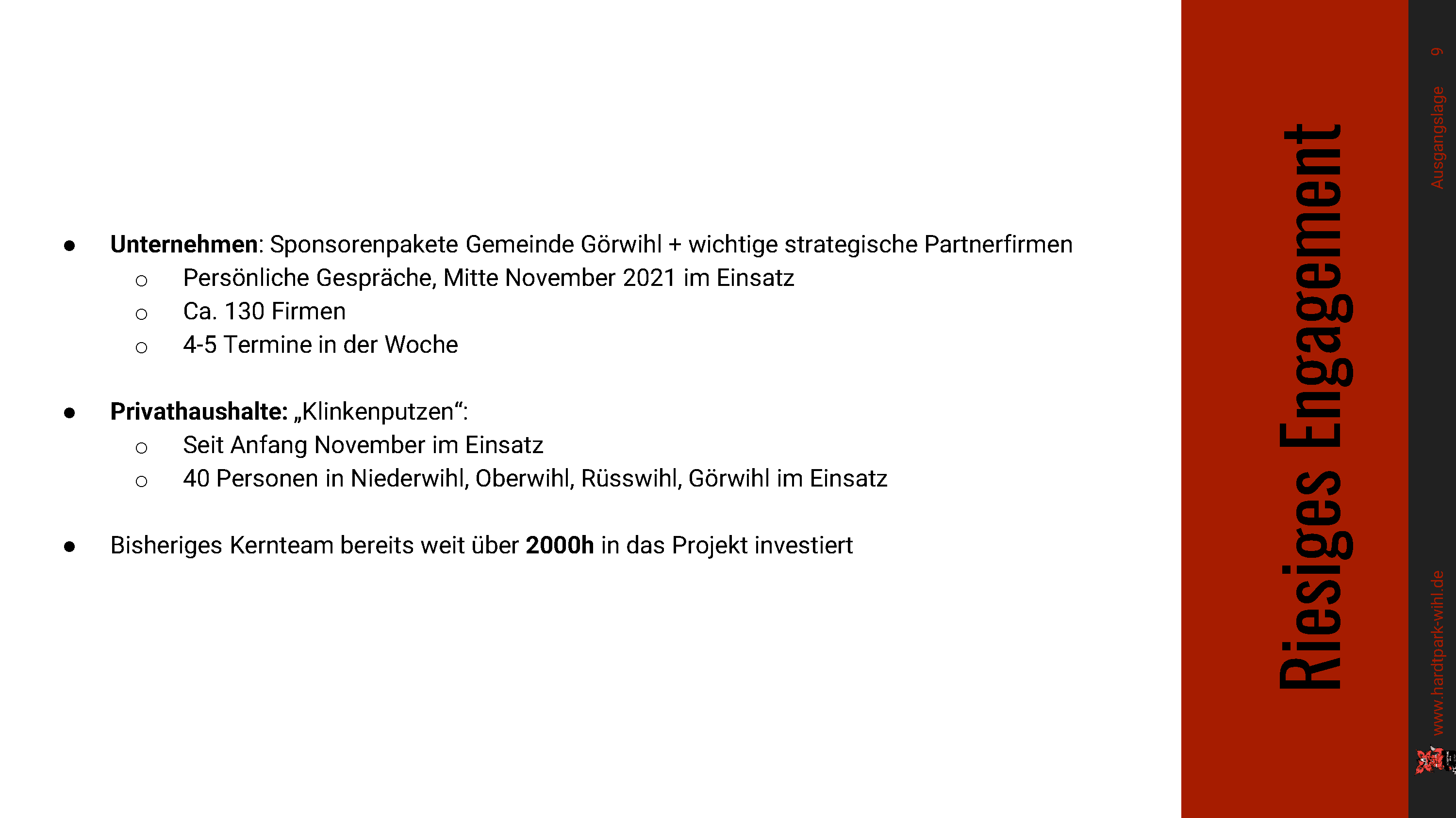 Die Vorstandschaft der Eintracht hat sich sehr schnell dazu entschlossen, dass Hardtpark Wihl Projekt unabhängig von den operativen Vereinstätigkeiten zu behandeln. Das Steuerungsteam wurde gegründet, dass sich rein um das Thema Hardtpark Wihl kümmert und vorantreibt.